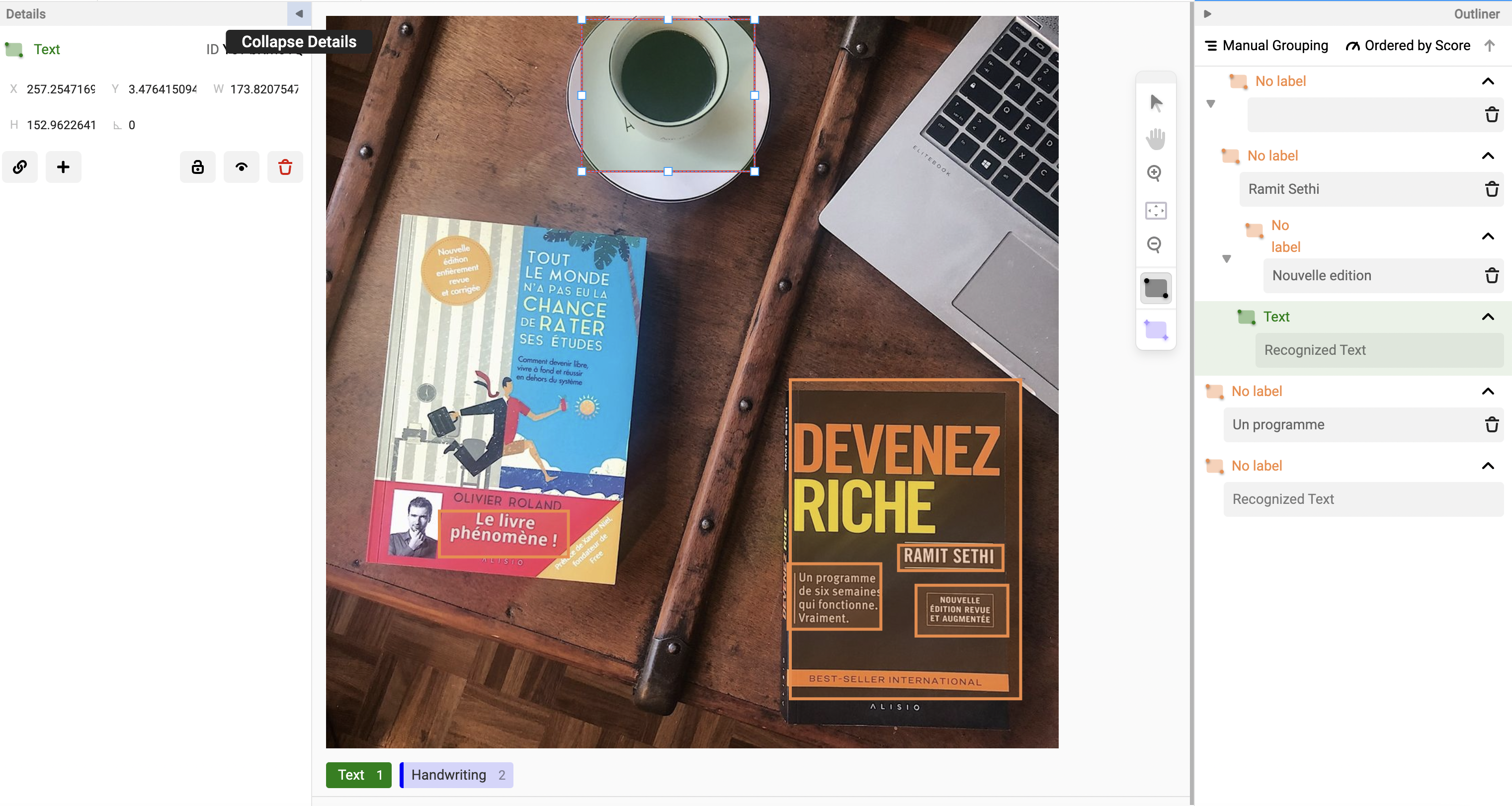 To add a region in the OCR transcription templates, draw a rectangle, and you can see a text box that appears in the Outliner panel to enter OCR text. The new functionality allows you to select a region and the Details panel changes. You can experience the following:
